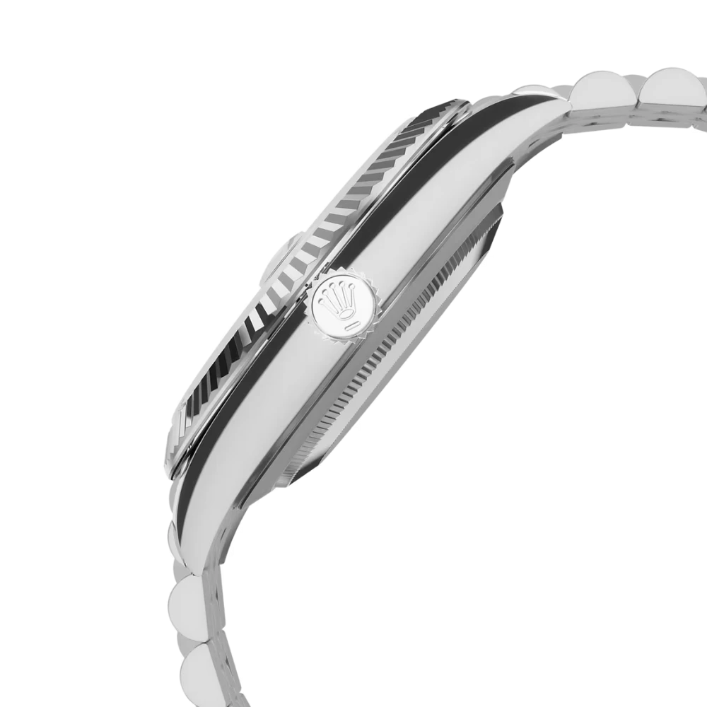 Bezel: Fluted, 18 ct white gold — a Rolex signature hallmark
