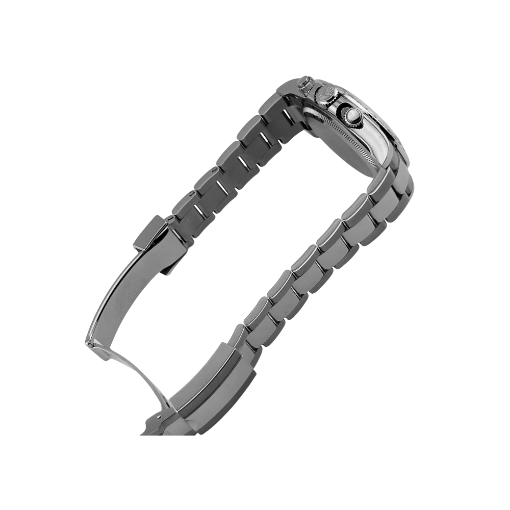 • Case: 18K white gold, 40 mm, Oyster construction with screw-down chronograph pushers and Triplock winding crown.