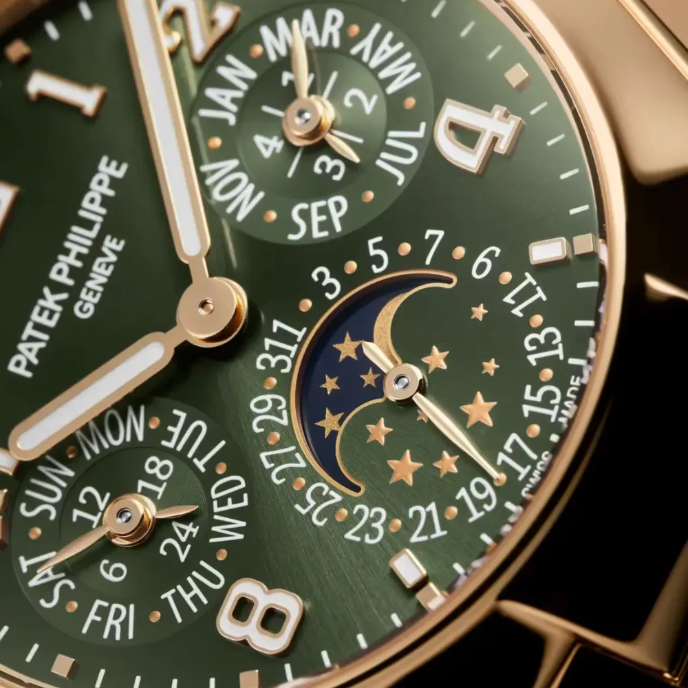 - Dial: Sunburst olive-green with elegant radial texture; balanced calendar sub-dials and moon-phase at 6 o’clock.