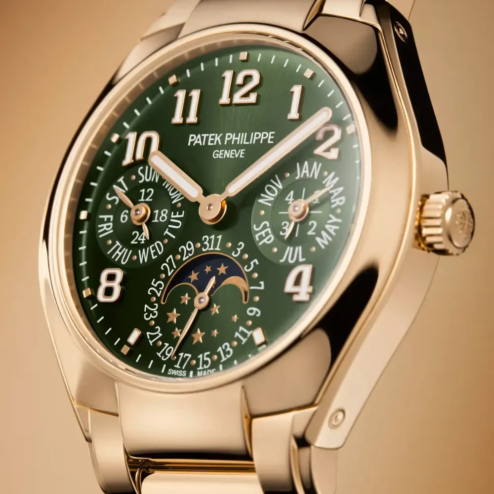 The Patek Philippe Twenty~4 Ref. 7340/1R-010 elevates the Twenty~4 line with a refined perpetual calendar in a wearable 36 mm format. Crafted entirely in 18K rose gold and paired with a vibrant sunburst olive-green dial, it blends feminine elegance with one of Patek Philippe’s emblematic high complications.