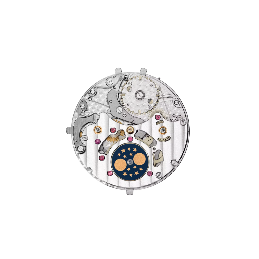 - Functions: Hours, minutes; perpetual calendar with day, date, month, leap-year and 24-hour indication; moon-phase display.